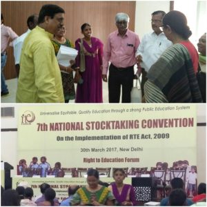 To lobby for the People’s Bill on The Right of Children to Free, Compulsory, Quality, Equitable Education up to 18 years (12th std ) Act, 2015 HRF, through the Tamil Nadu Forum on Right to Education, submitted the draft bill to Mr. Ambrish Rai, National Convener, National RTE Forum at the 7th National Stocktaking Convention on the implementation of RTE Act, 2009 held on 30 March 2017, New Delhi organised by Right to Education Forum.